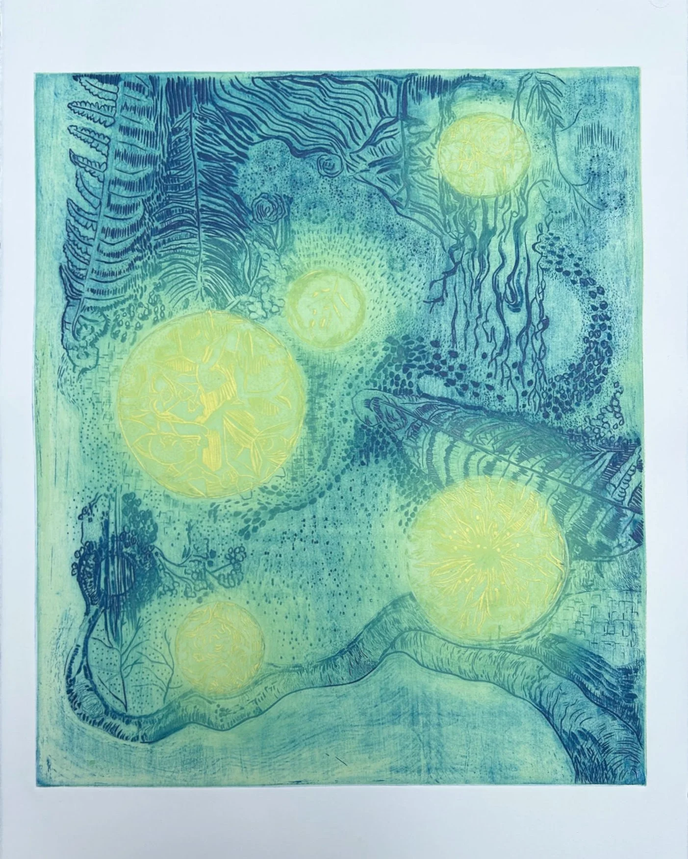 The photograph (see A), is of the final print, a woodcut entitled: Radiant Matter. I am asked, pretty often, “How did you do that?”—meaning how did I get four colors on the print with one run through the press. So there is a method to this madness. My woodcut has a carved pattern and I started by inking the oval shapes yellow, and a light green around them (see B). Then I added blue ink around those ovals (see photo C). Had I left it like that, and run it through, it would have printed as those three distinct colors—yellow, green and blue. Instead, to integrate these colors a light green ink was rolled on to a plexiglass (the same size as the woodcut)—(see video). The BFK paper (now inked green) is ready to be set in position over the inked plate. This was a very intentional use of the colored green ink so as to give the final print a unified, overall tone. Finally, the paper is placed directly on the woodcut and in position (matching up the corners so that it is registered correctly). When the paper is run through the press and then pulled away from the inked plate, what is revealed is the final print—with four colors. This print has a definite glow that otherwise would not have happened without this process. Sort of magic.